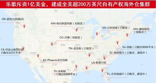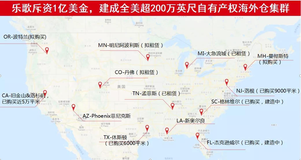 至今,乐歌斥资1亿美元已在美国沿海地区购买7个自有仓9.5万平方米,单体最大海外仓达3.6万平方米,租赁7个仓共计4.1万平方米,全球布局14个仓,总面积达13.6万平方米。