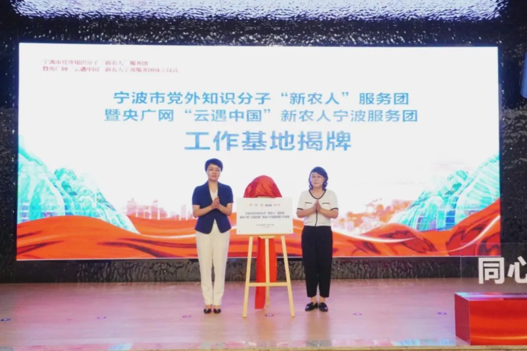 娄黛敏与陈金莲一起为宁波市党外知识分子“新农人”服务团暨央广网“云遇中国”新农人宁波服务团工作基地揭牌。