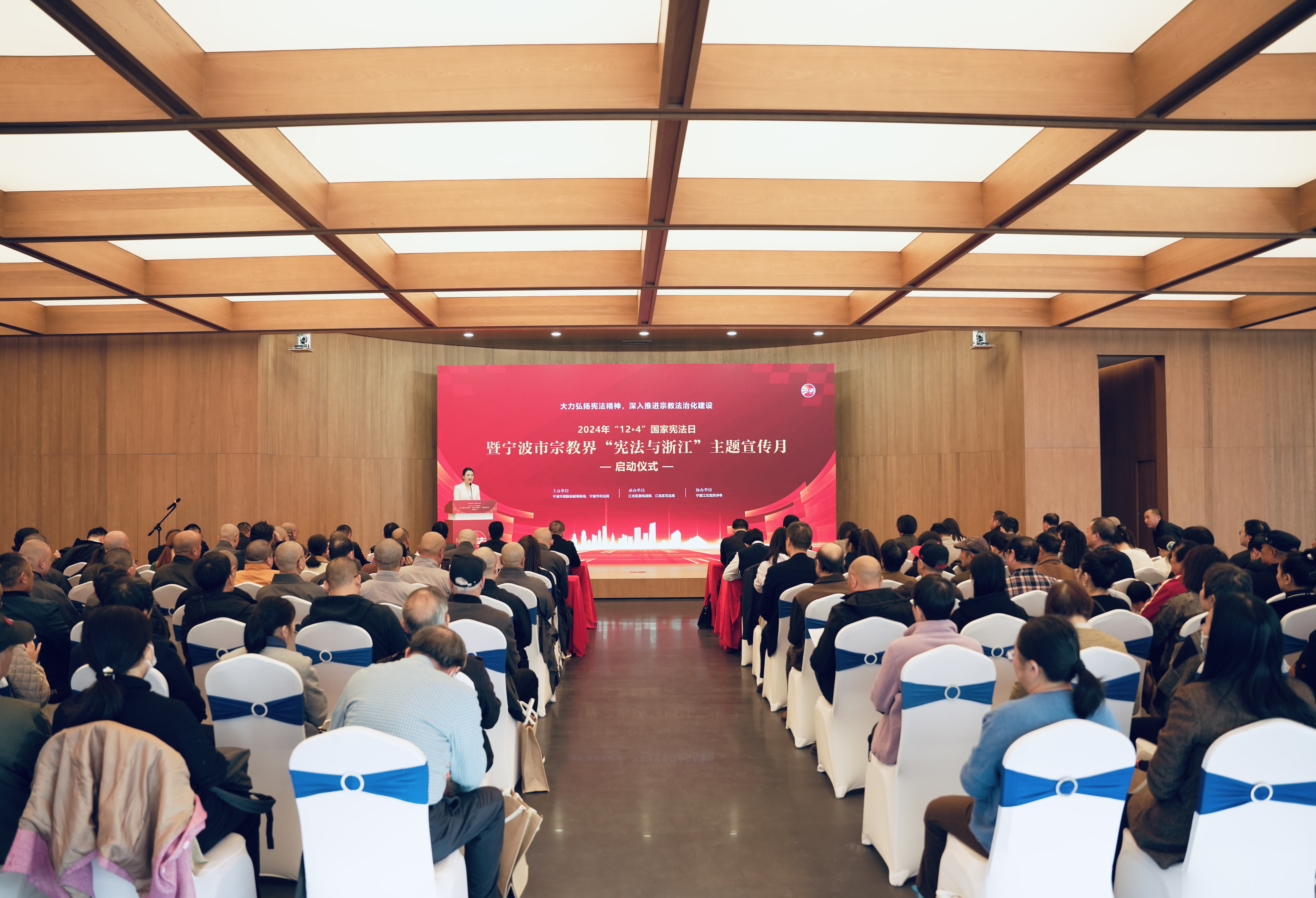 为深入学习贯彻习近平法治思想,进一步弘扬宪法精神,深入推进宗教法治化建设,12月2日上午,由宁波市民族宗教事务局和宁波市司法局联合主办、江北区委统战部和江北区司法局承办的2024年“12·4”国家宪法日暨宁波市宗教界“宪法与浙江”主题宣传月启动仪式在江北宝庆讲寺举行。