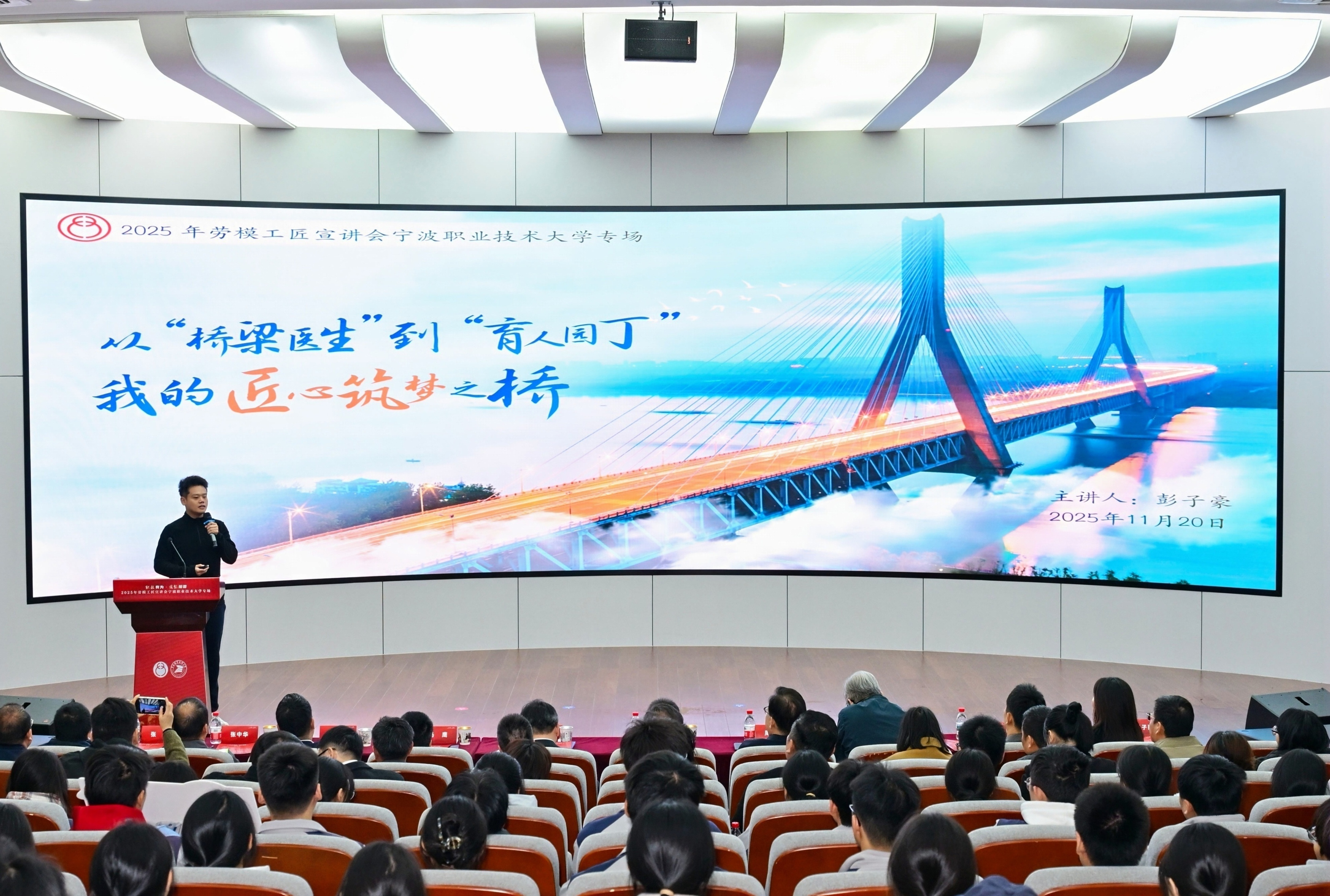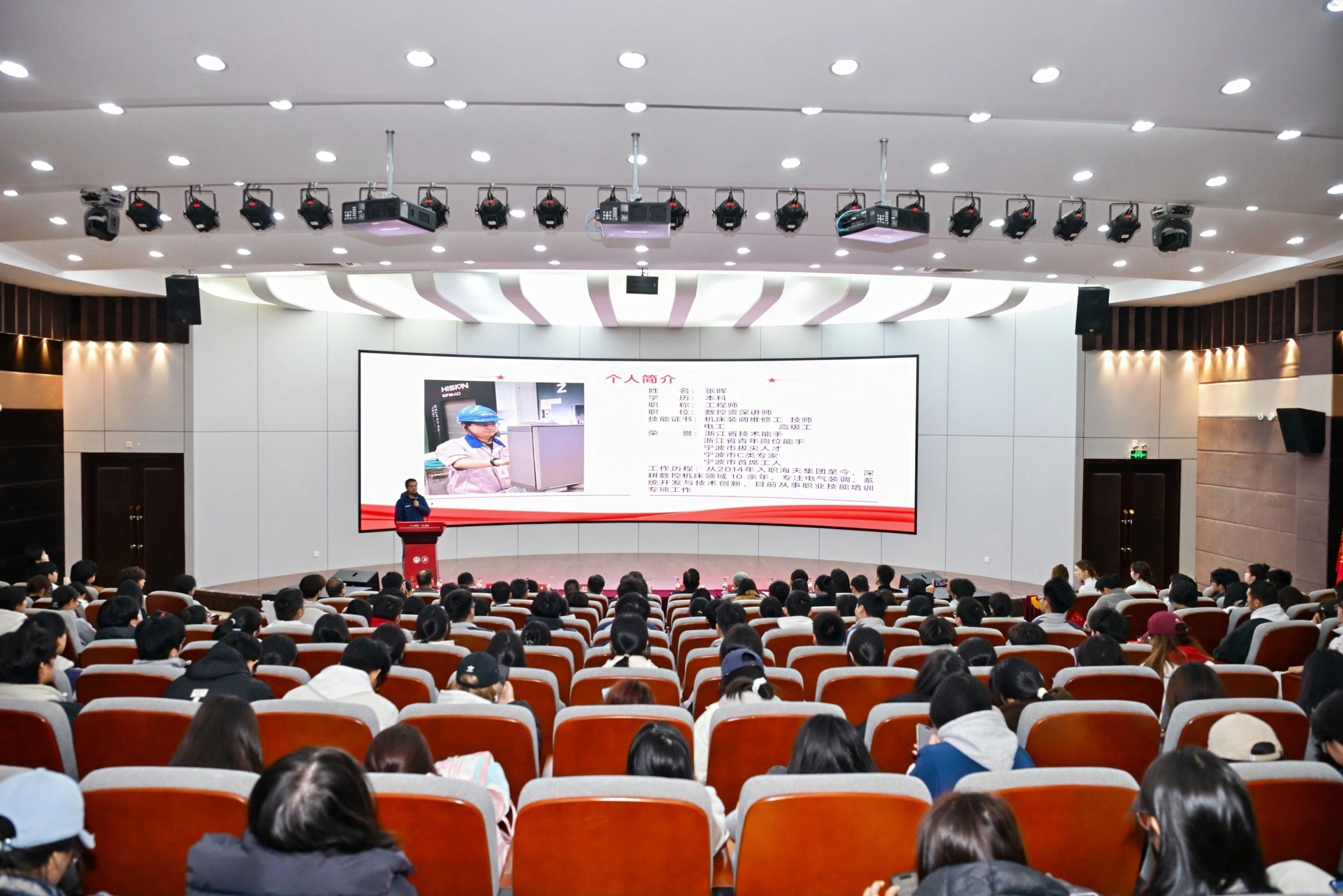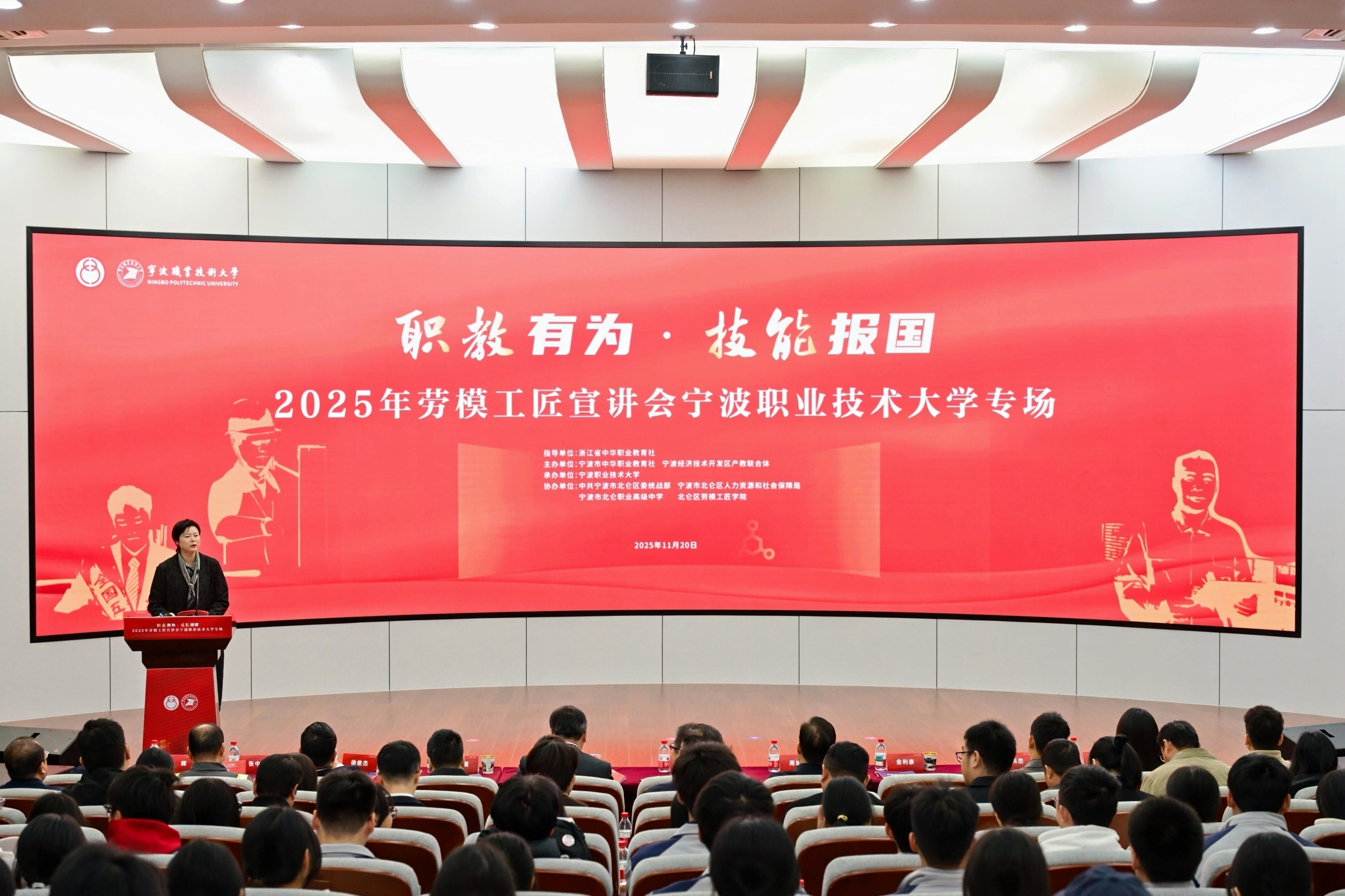 宁波职业技术大学校长、党委副书记,市中华职教社副主任吴向鹏致欢迎辞。他表示,学校始终致力于培养高素质技术技能人才,希望通过此次活动,能让工匠精神在校园里深深扎根。 大国工匠、国家级技能大师工作室领办人张中华以《匠心铸梦・向新而行》为题,生动讲述了自己如何从一名普通的一线电工,通过数十年如一日的深耕细作,最终成长为国家级技能大师的逐梦之路。他说,干一行、钻一行、精一行,不努力奋斗终究会有被淘汰的一天。 全国五一劳动奖章获得者彭子豪在《从“桥梁医生”到“育人园丁”》的分享中,回顾了自己从技术能手成功转型为教育工作者的人生转变,诠释了让工匠精神薪火相传的责任与担当。他说,中国工匠的肩膀,扛得起山河万里,也托得住寰宇期冀。 浙江省技术能手张晖以《以技能筑梦,以匠心致远》为题,用亲身经历激励在场的学弟学妹们要立足专业、锤炼本领、服务社会,实现人生价值。他说,用精益求精迎接智能制造时代,为国家高端装备产业贡献力量。 活动现场举行了聘任与结对仪式。宁波市委统战部副部长、市中华职教社副主任周培剑为3位宣讲员颁发了聘书,聘任张中华、彭子豪、张晖为宁波市中华职业教育社宣讲团成员。同时,为构建“师带徒、徒成匠”的良性育人机制,宁波职业技术大学贺贤土学院的6名职教本科生与3位劳模工匠现场完成了师徒结对。 活动强调,宁波市中华职教社将充分发挥桥梁纽带作用,紧密对接宁波“361”万千亿级产业集群建设需求,持续深化产教融合,助力完善“企业出题、学校解题、学生答题”的协同育人机制。同时,进一步做优做强“劳模工匠进校园”等思政引领品牌,将工匠精神有机融入人才培养全过程,为宁波高质量发展广泛凝聚共识、系统培育更多高素质技术技能人才。活动勉励广大青年学子以劳模工匠为榜样,树立远大理想,将个人发展融入国家发展的宏伟蓝图,为实现民族复兴贡献青春力量。 活动现场还进行了宣讲活动接力举办交接仪式,下一期承办单位宁波卫生职业技术学院代表接过了象征传承与延续的宣讲会会旗。 活动开始前,与会嘉宾还一同参观了宁波职业技术大学的教育教学基地,实地感受学校的办学特色与成果。 宁波市中华职教社社员代表、北仑技能大师工作室代表以及来自宁波职业技术大学、宁波市北仑职业高级中学的师生代表共计200余人参加了本次活动。